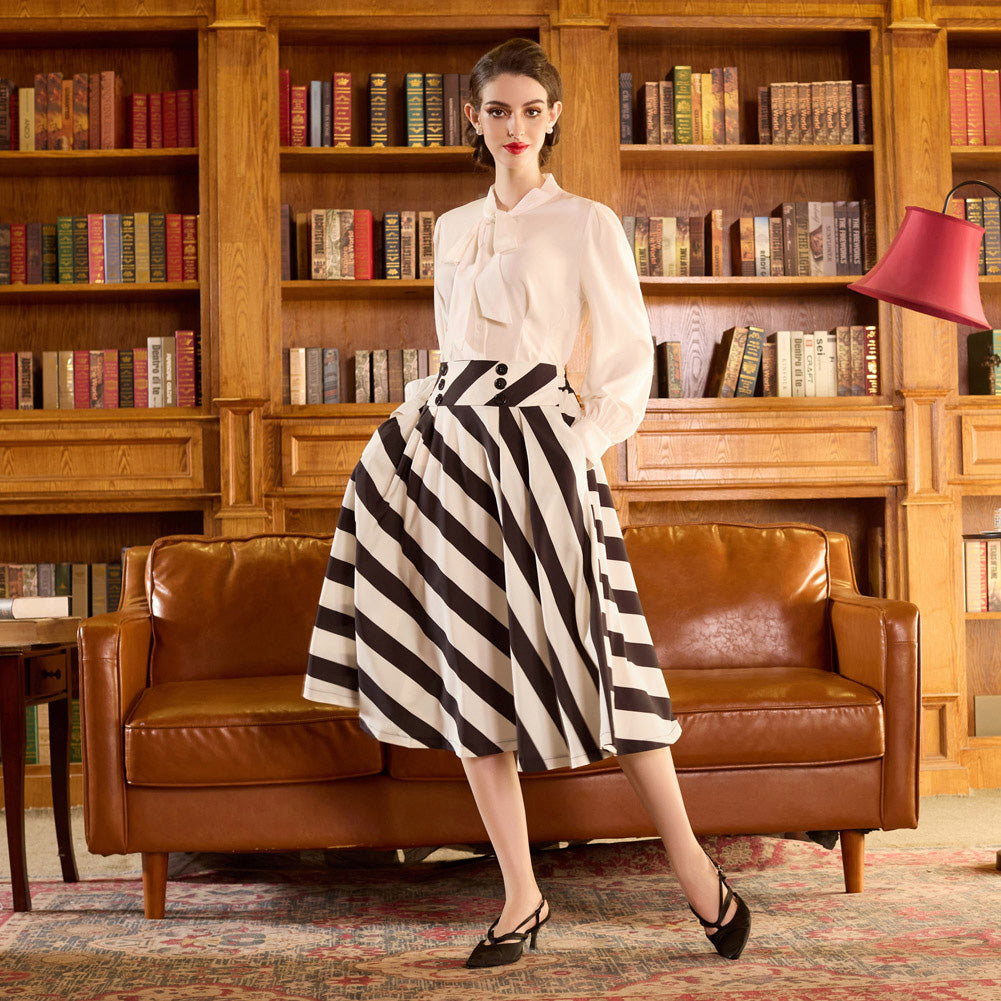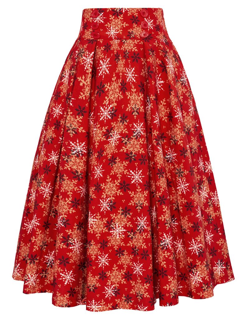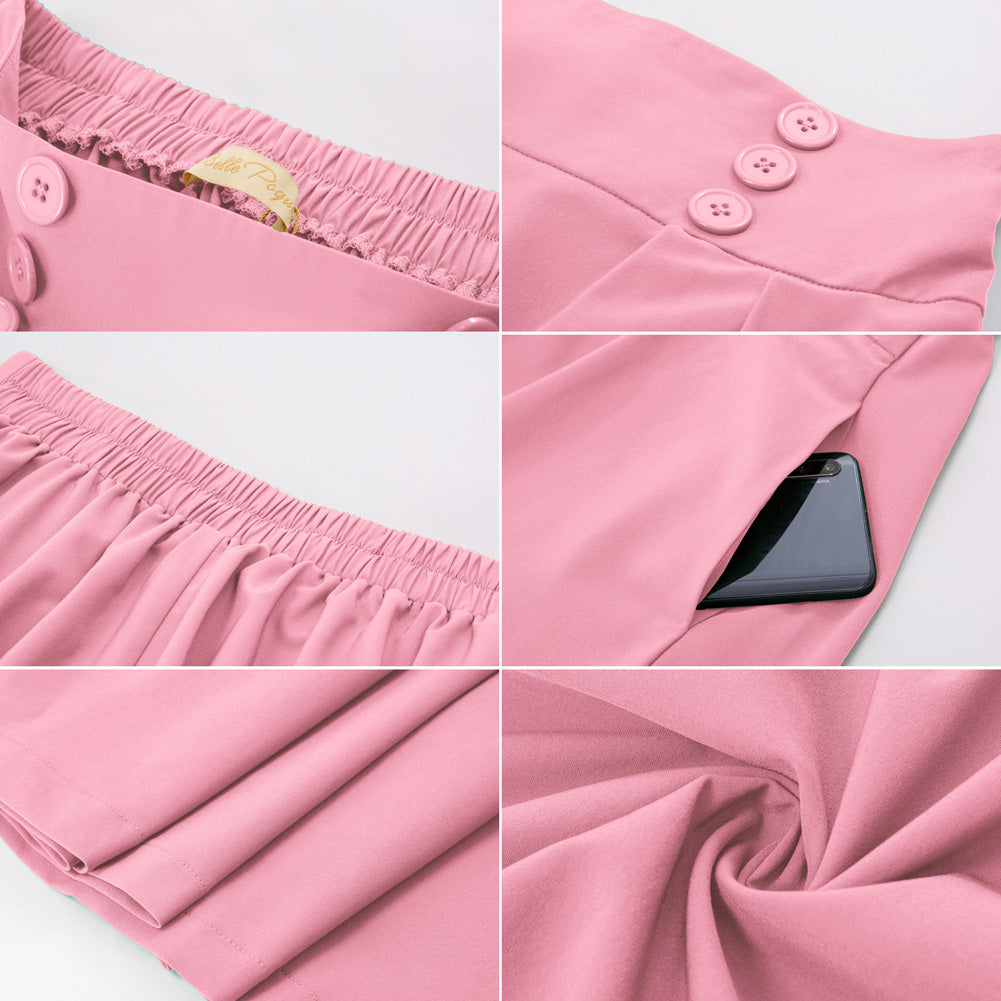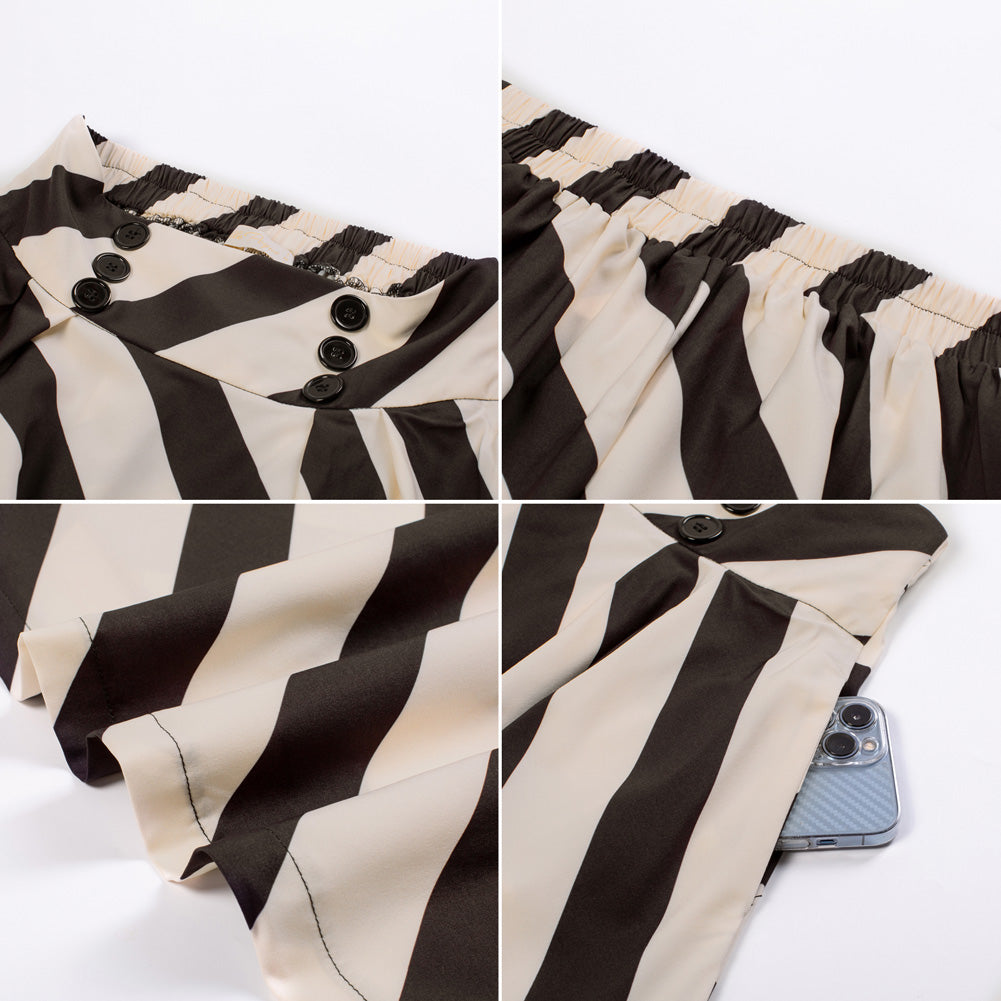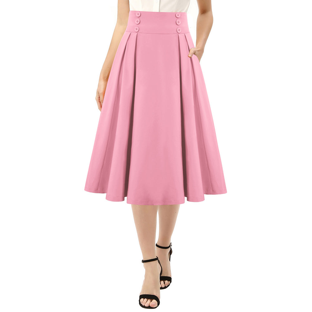 Pleated Buttons Decorated Elastic Waist High Waist Swing A-Line Skirt with Pockets